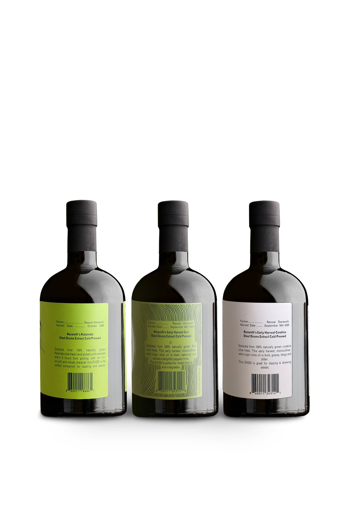 Three bottles, one vision: Nazareth’s Golden Trio brings together the boldness of Coratina, the smooth fruitiness of Suri, and the rare sweetness of Kalamata. Each expresses a different face of Nazareth, all born from the same soil and the same devotion to the craft.