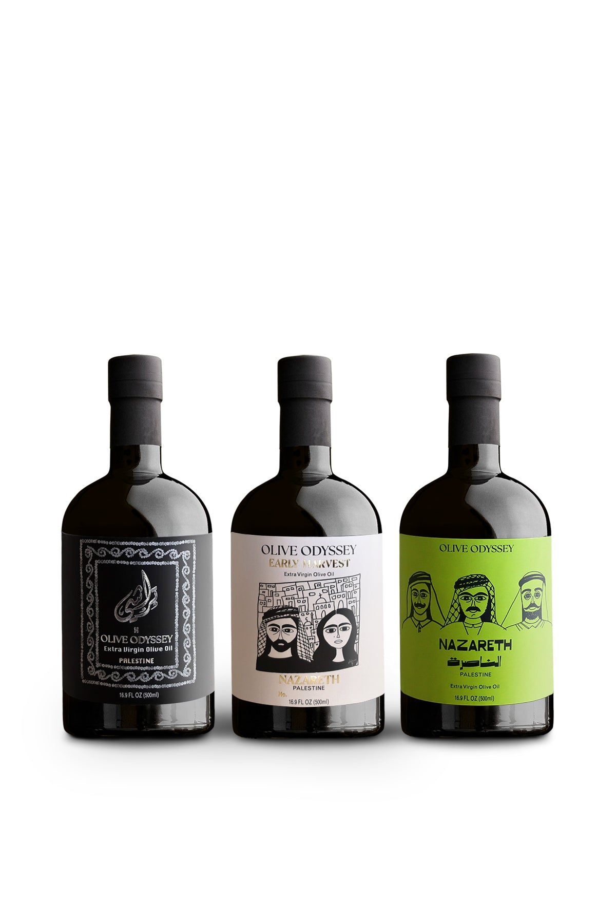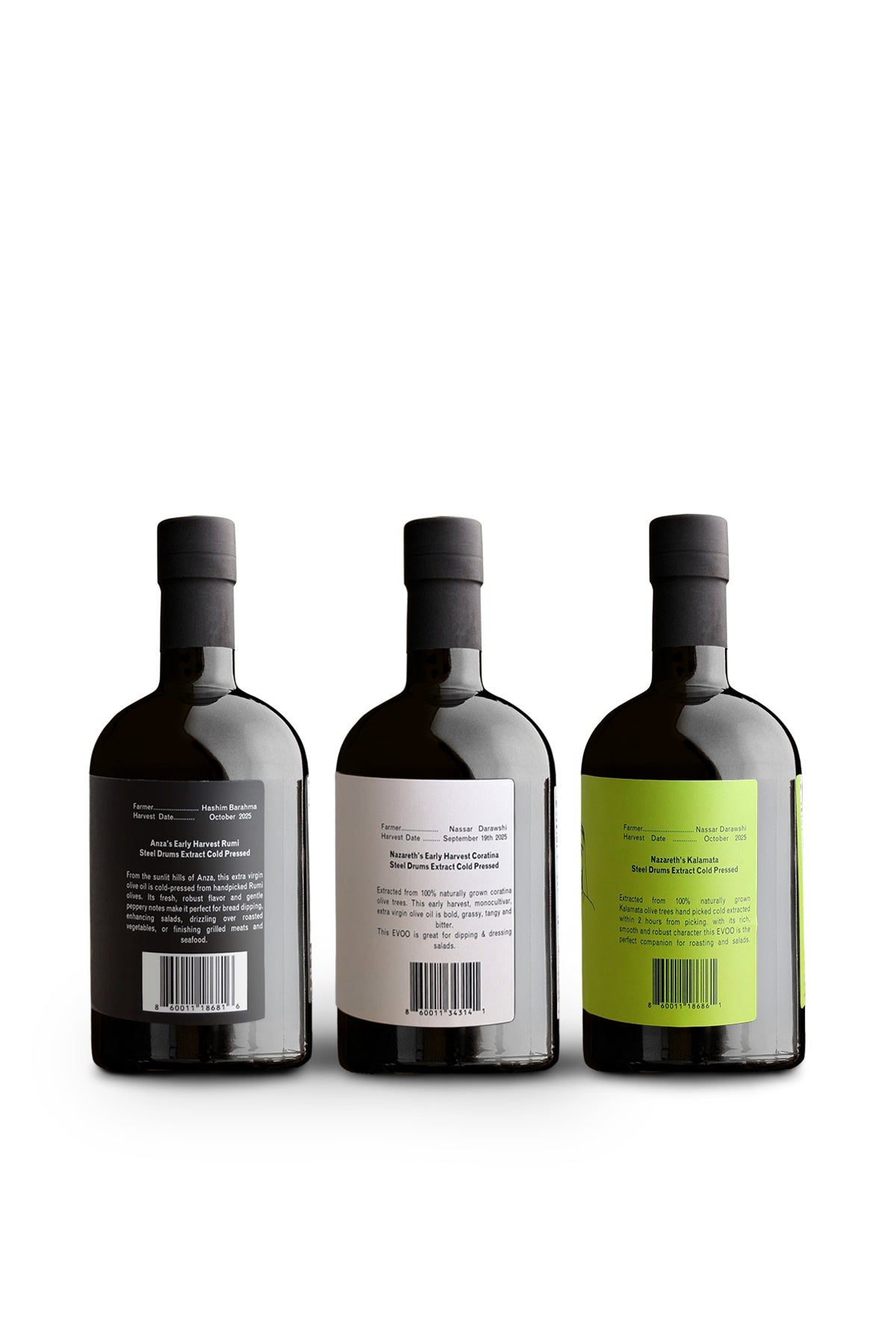 The Kalamata is where heat meets sweetness. Nassar Darawshi presses it from one of the rarest varieties in his Nazareth groves, and it performs best when it's working: in the pan, over roasting trays, absorbed into warm food. The Anza comes from organic cooperative land near Jenin, pressed early when the fruit is still green and full of fight. It brings body and spice to anything that needs weight. The Coratina is Italian by origin, Palestinian by soil, and completely uncompromising. High in polyphenols, deeply bitter, built for finishing or for those who drink their oil straight.