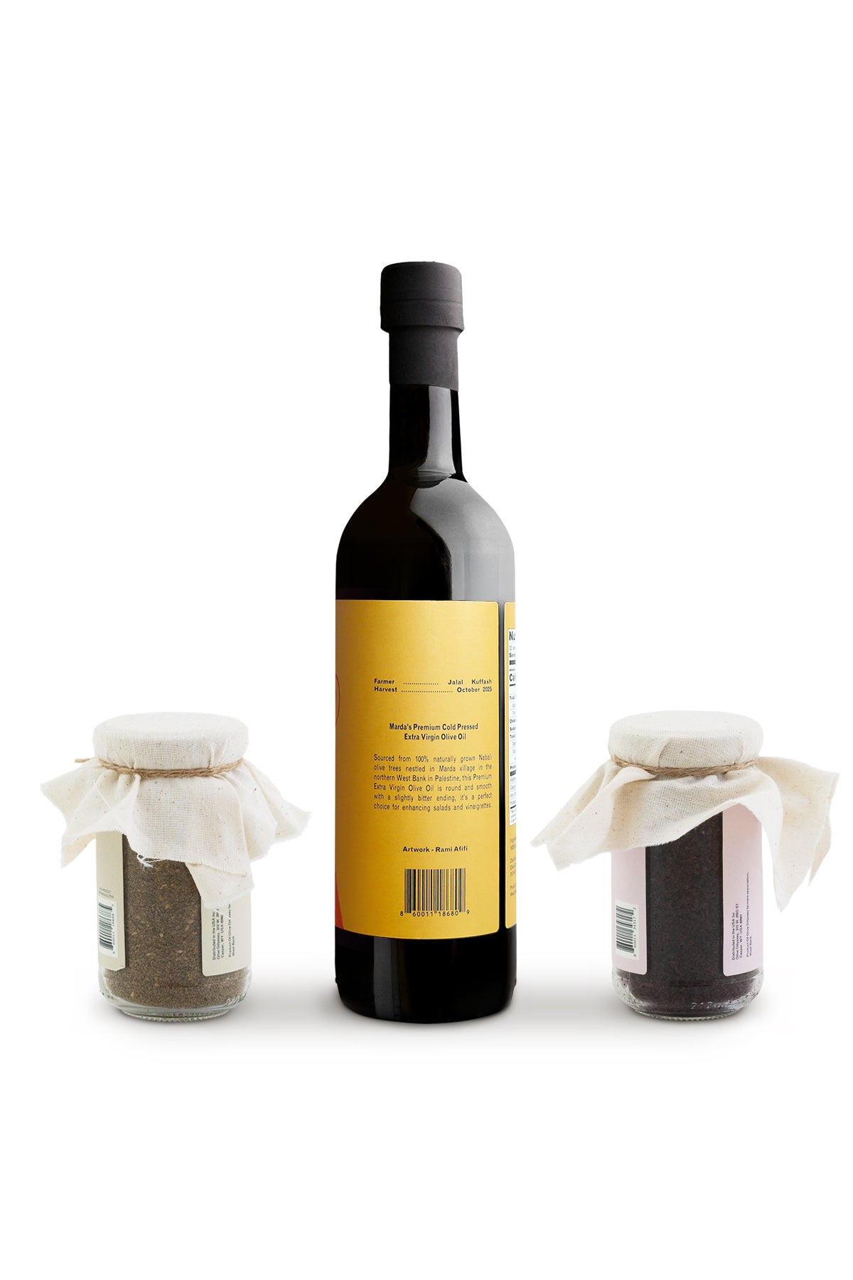 Marda’s Nabali olive oil forms the base. Smooth, olive-forward, and gently bitter, it carries the warmth of wild thyme and sesame, and softens the sharp citrus edge of sumac. Together, they create the balance that defines Palestinian flavor.
