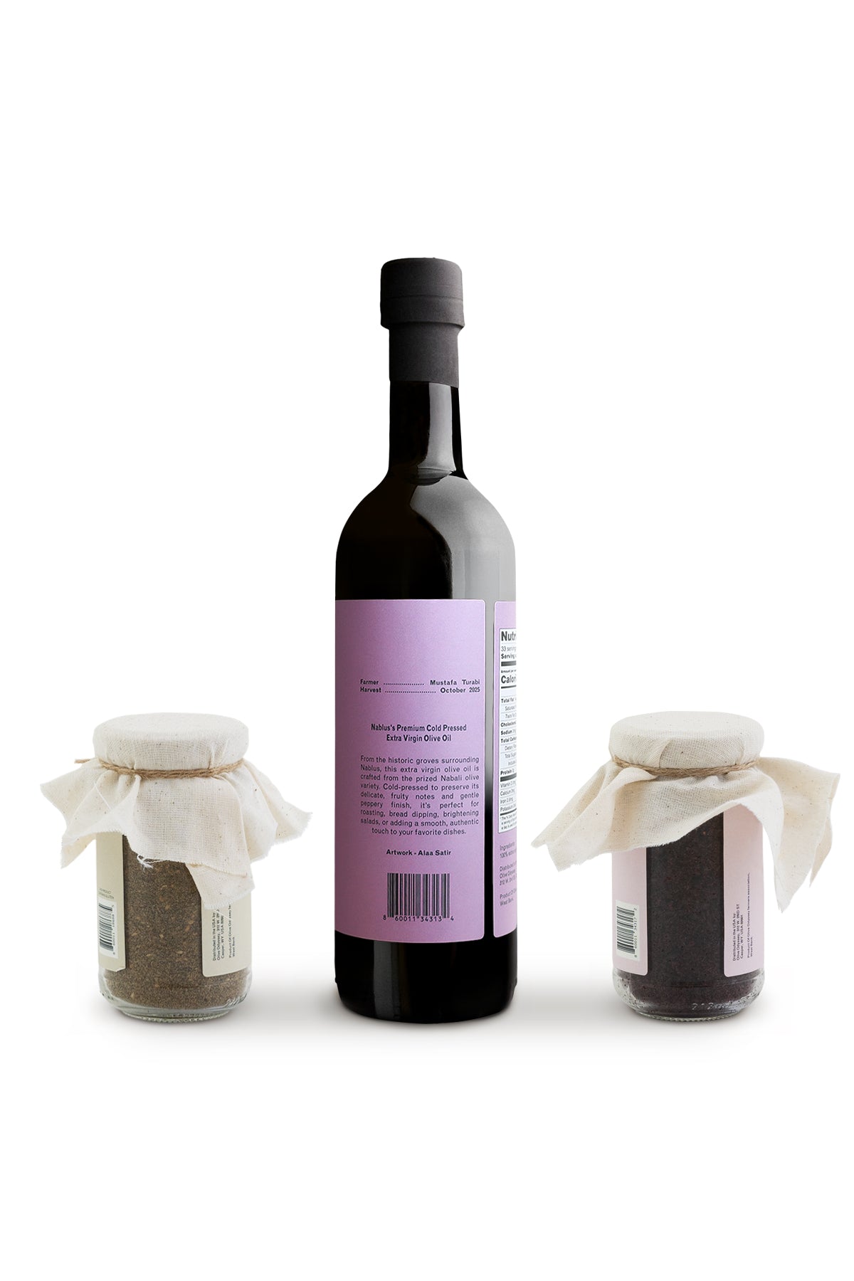 This set brings together the warmth of Nablus’s Nabali olive oil, the aroma of wild zaatar from Bidu, and the citrus tang of mountain-grown sumac.