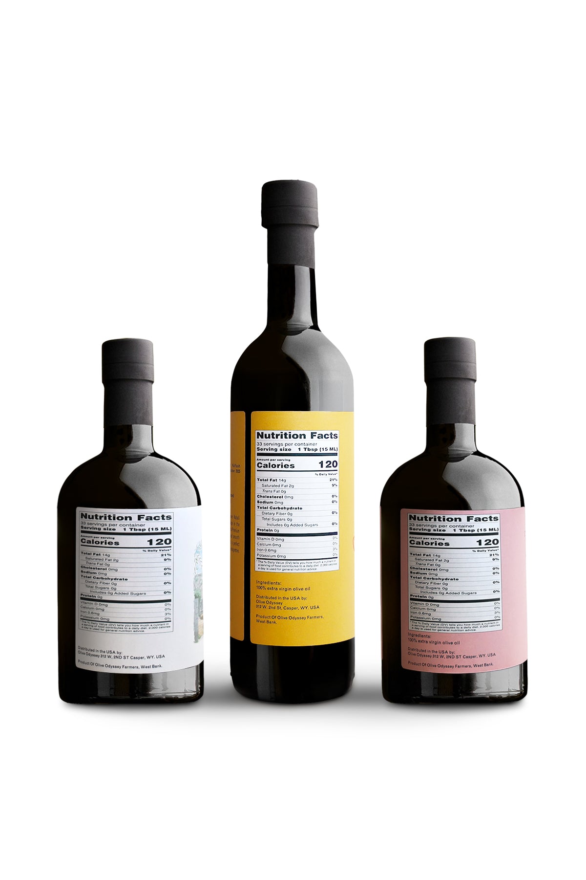 2 × 500 ml (16.9 fl oz) Olive Oils + 1 × 750 ml (25.4 fl oz) Olive Oil | Cold-pressed in steel drums