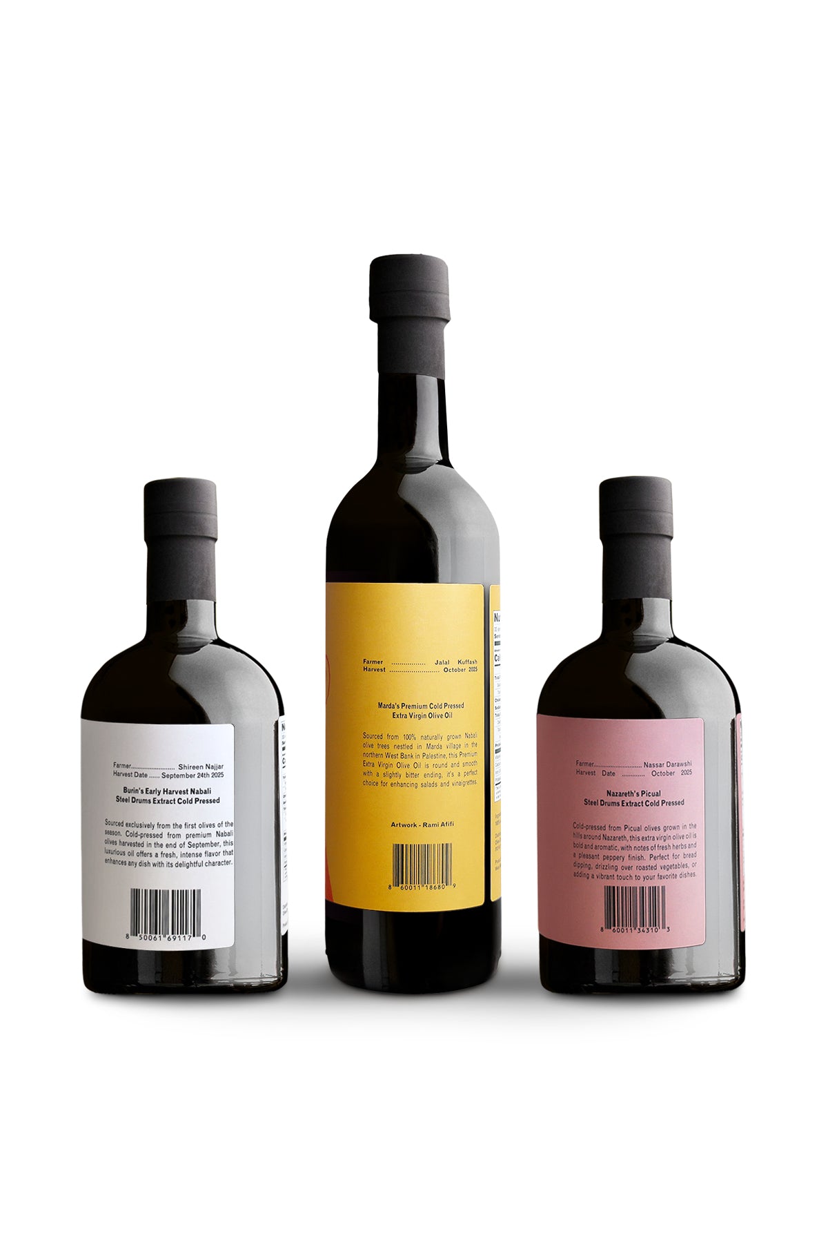 A trio of Palestinian olive oils connected by a shared Nabali lineage and shaped by three villages, three families, and three expressions of the land. From the Galilean hills of Nazareth to the terraced slopes of Burin and the limestone fields of Marda, this bundle traces how one olive tradition unfolds across place, season, and hand.